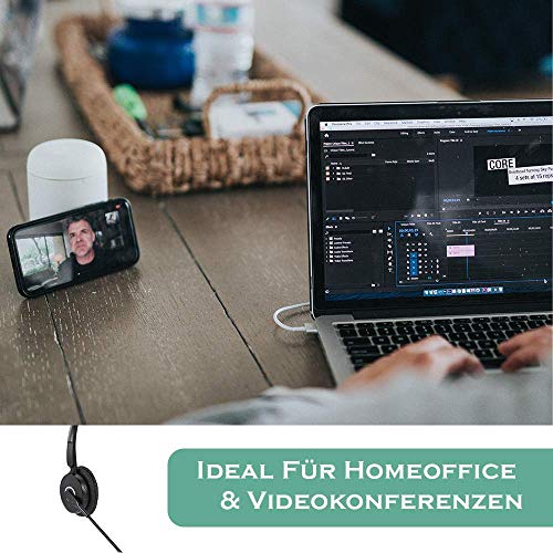 Elegante bluetooth-headset voor laptop en mobiele telefoon: zwarte, vederlichte behuizing, hoogwaardige afwerking en twee flexibele microfoons garanderen een perfect draaggevoel voor een oor (eenzijdig links en rechts) op kantoor en thuiskantoor voor videoconferentie.