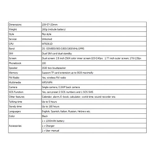 Dual TFT display screen:The flip mobile phone comes with double display screen, 2.8inch, 256K inner screen and 1.77inch outer screen.